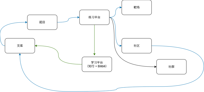 我们已经有了现有的CTF练习平台,但是很多小伙伴都反馈说找不到一个合适的学习成长路线,我的想法比较简单,依托现有的练习平台、靶场、社区,融汇贯通当前文库的知识体系,将知识体系再归纳到题目进行闭环。这样大家在看文档学习知识技术或者看相关视频学习技术知识的时候有题可练,有社区可讨论。